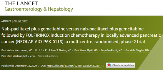 [1]Kunzmann Volker,Siveke JT,Algül H,et al.Nab-paclitaxel plus gemcitabine versus nab-paclitaxel plus gemcitabine followed by FOLFIRINOX induction chemotherapy in locally advanced pancreatic cancer(NEOLAP-AIO-PAK-0113):a multicentre,randomised,phase 2 trial[J].Lancet Gastroenterol Hepatol.Published:December 15,2020.