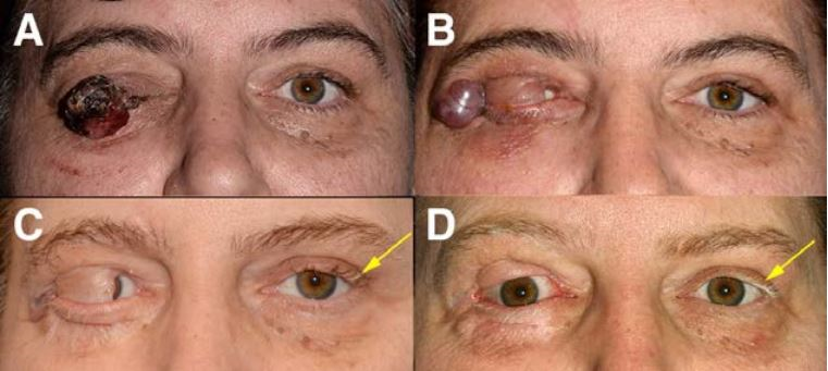 患者眼角的恶性黑色素瘤,治疗后基本完全缓解了,但是另一只眼睛的睫毛几乎全白了。