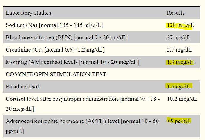 下图是一例典型的PD-1抗体导致的肾上腺皮质功能不全的患者,抽血化验的化验单:低钠(只有128,正常值135以上)、低皮质醇(只有1.3,正常值是10以上)、低ACTH(在5以下,正常值应该在10以上)。