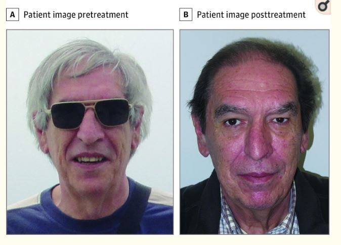 2017年美国医学会皮肤病学杂志,公布了一个鼓舞人心的好消息:14名肺癌患者接受PD-1抑制剂治疗后,出现了不同程度的头发变黑、返老还童的现象。事实上,类似的现象在国内的病友中也有所报道。下图就是医学杂志上征得患者本人同意后,刊登出来的患者使用PD-1抗体后头发变黑的对比照: