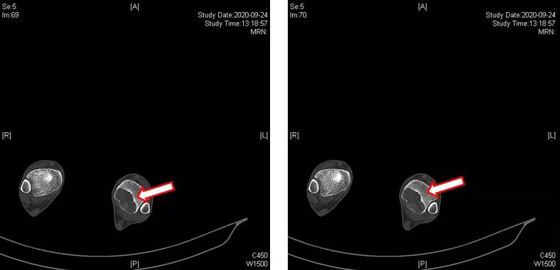 本例患者为年轻男性,确诊为左侧胫骨远端GCTB。患者病灶范围较大,且累及后踝关节面,胫骨后侧皮质膨胀破坏变薄,应首选保关节的治疗方案,保留踝关节功能。
