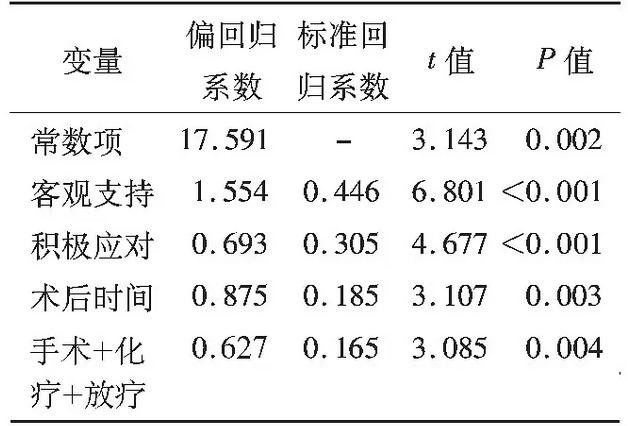 社会支持是指个体与亲属、朋友、同事等人以单位、党团、工会等社会各方面所产生的精神上和物质上的联系程度,良好的社会支持可以减轻由于自身解决问题能力不足而产生的消极情绪,促进患者与社会的接触和情感交流,减少情感和社会退缩。同样,有研究已证实,社会支持与个体创伤后成长相关,亲属、朋友、医务人员等的情感和信息支持是个体创伤后成长的重要促进者。在本研究中,客观支持是患者配偶创伤后成长的重要影响因素,但可能由于男性与女性相比更不愿意表达自己的感情,且育龄期的患者配偶一般子女年纪小,父母年纪大,从家庭得到的支持相对较少,因此,患者配偶对社会支持的利用度不高,这提示在临床护理中,医务人员不但要给患者提供充足的情感和信息支持,同时也要让患者配偶参与进来,让患者配偶感受到来自医务人员的支持,也要鼓励患者配偶主动向家人和朋友倾诉自己的想法,积极寻求支持和帮助,提高其社会利用度。