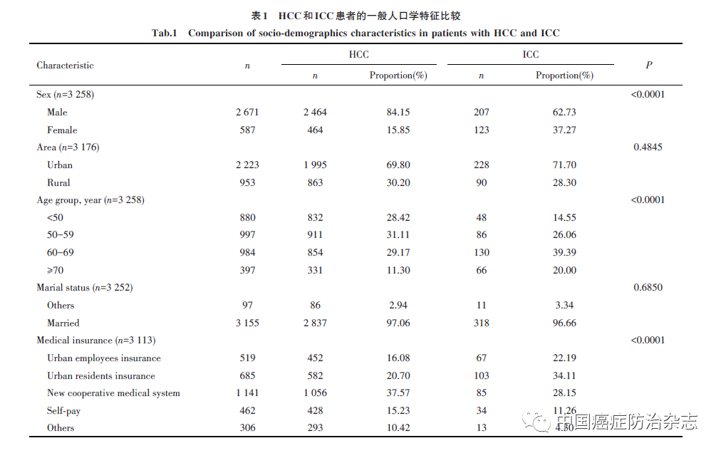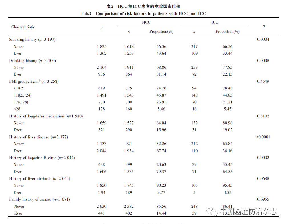 肝癌是全球最常见的恶性肿瘤之一。根据国际癌症研究机构的最新统计报告(GLOBOCAN 2020)结果,2020年全球肝癌新发病例和死亡病例分别为90.6万和83.0万,分别位居恶性肿瘤发病谱和死亡谱第6位和第3位。中国是肝癌高发国家,2020年中国肝癌新发病例和因肝癌死亡病例数约占全球肝癌发病和死亡病例的45.3%和47.1%,肝癌已经成为影响我国人民健康的重大公共卫生问题之一。HCC和ICC是肝癌的主要病理类型。大量研究表明,两类肝癌在发病机制、流行病学、临床诊疗以及预后等方面均有很大差异。本研究通过收集全国多家医院的肝癌首诊病例,多角度对比分析HCC和ICC的临床诊疗特征,为肝癌的精准防控提供基础信息。