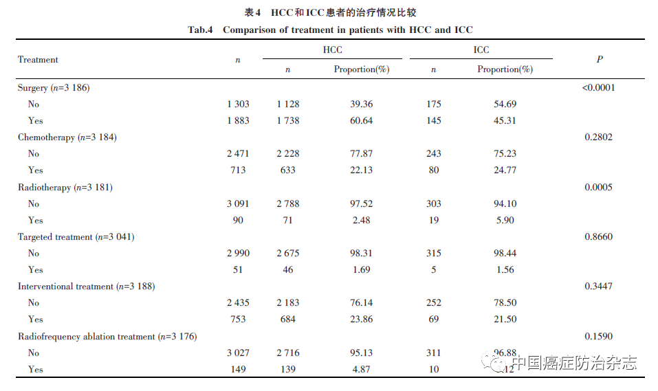 总体来看,HCC和ICC患者常用的治疗方式从高到低依次为手术、介入治疗、化疗、射频治疗、放疗和靶向治疗。HCC和ICC手术率分别为60.64%、45.31%,差异有统计学意义(P<0.0001);放疗率分别为2.48%、5.90%,差异也有统计学意义(P=0.0005)。HCC和ICC患者化疗率、靶向治疗率、介入治疗率和射频治疗率差异无统计学意义(P>0.05),见表4。