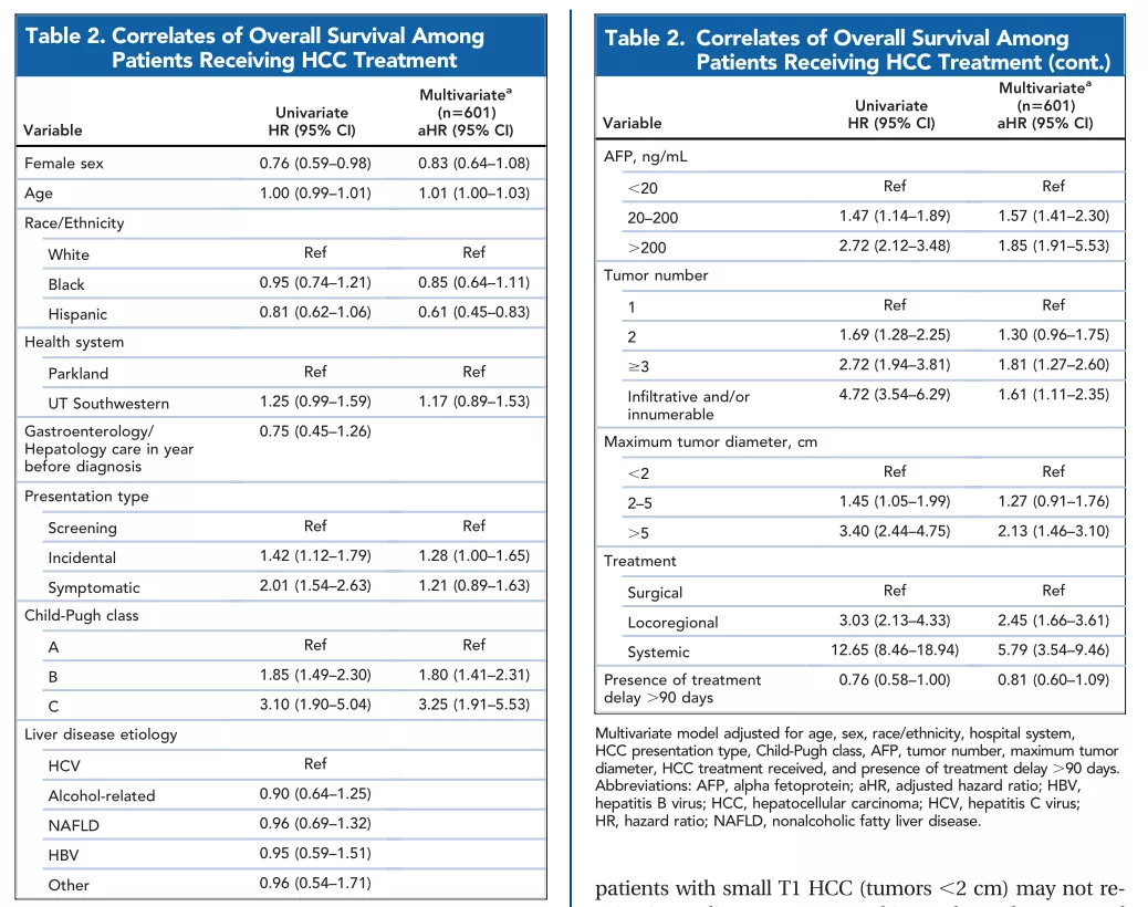 未调整分析发现,治疗延迟和不延迟患者的总生存期(OS)没有明显统计学差异(32.9 vs 27.6 个月; HR, 0.94; 95% CI, 0.64–1.37)。而经过对年龄、性别、种族、健康情况、发现类型、肿瘤负荷、AFP水平、Child-Pugh分级和初始治疗方式进行调整,治疗的延迟同样并不影响预后(HR=0.90; 95% CI, 0.60–1.35)。