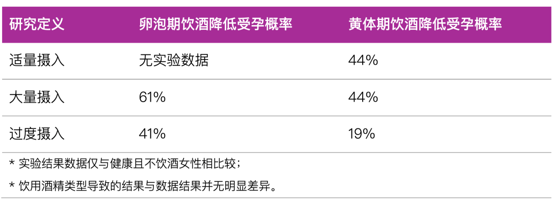 研究数据表明:相比于不饮酒女性,饮酒女性在月经周期的任何阶段大量摄入和过度摄入都会使受孕概率显著降低(详见下表):