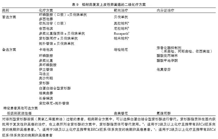 对复发的上皮性卵巢癌,首先根据PFI或无治疗间期对患者进行分型,从而采取相应的治疗措施。对铂类敏感型复发,首选以铂类为基础的联合化疗或联合贝伐珠单抗,再予以PARP抑制剂或贝伐珠单抗维持治疗。对铂耐药型或难治型复发,则首选非铂类单药化疗或联合抗血管生成靶向药物的联合化疗(表8、9)。