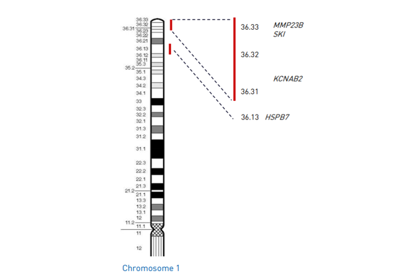 什么导致了1p36缺失综合征?通常认为,1p36微缺失的基因片段,最常见的断点在1p36.13到1p36.33之间,这个区间大概包含了300万到500万个碱基对。其中,研究人员发现,KCNAB2基因的缺失,和癫痫发作有很大关联;1p36.13区域上的HSPB7基因,和性早熟与隐睾症有关;MMP23B基因缺失,则和大脑发育迟缓有关。
