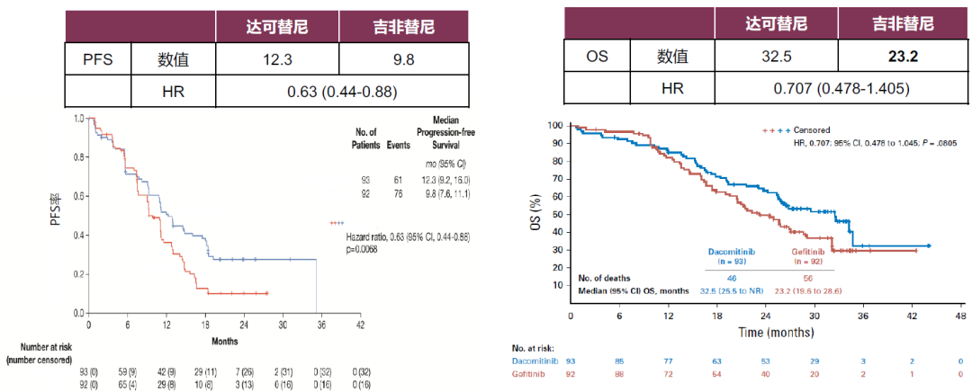 ARCHER 1050研究L858R亚组分析显示,达可替尼能明显延长PFS,但PFS获益未能转化为OS获益:达可替尼和吉非替尼治疗L858R突变患者的中位PFS分别为12.3个月和9.8个月(HR=0.63;95%CI:0.44-0.88;P=0.0068),中位OS分别为32.5个月和23.2个月(HR=0.707;95%CI:0.478-1.405;P=0.0805)(图3)[10,11]。