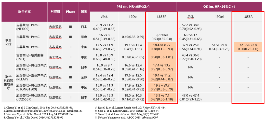 EGFR-TKI单药治疗对L858R突变NSCLC患者疗效不佳,但其与其他治疗方式联合可能是进一步提升EGFR突变阳性晚期NSCLC患者的另一策略。一项对现有临床研究数据开展的综合分析显示,L858R突变NSCLC晚期患者可能从TKI联合治疗中获益更多(表1)。