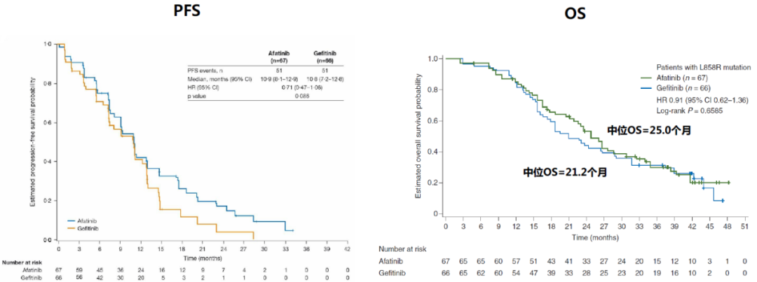 LUX-Lung 7研究L858R亚组分析结果显示,阿法替尼和吉非替尼治疗L858R突变患者的中位PFS(10.9个月 vs 10.8个月;HR=0.71;95%CI:0.47-1.06;P=0.086)和中位OS(25.0个月 vs 21.2个月;HR=0.91;95%CI:0.62-1.36;P=0.6585)都没有显著差异(图2)[8,9]。阿法替尼未能改善L858R突变NSCLC患者的PFS和OS。