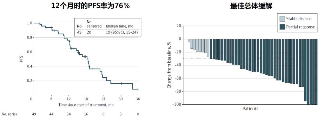 目前已完成的一项奥希替尼联合贝伐珠单抗治疗EGFR突变型转移性肺癌患者的I/II期单臂临床研究结果显示,在该研究的49位患者中,这一联合治疗的中位PFS达到19个月,12个月时患者PFS率达76%,总体缓解率为80%(图8)[15]。惊人的治疗效果预示该治疗方案有望显著改善L858R突变NSCLC患者的临床治疗效果。