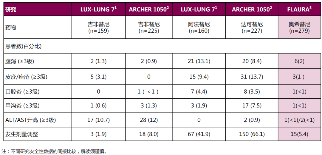 但联合方案不良事件更多,无论何种联合治疗,均需注意毒性问题。对比一代、二代、三代EGFR-TKI一线治疗临床III期研究的安全性数据显示,奥希替尼一线治疗的不良反应发生率及剂量调整比例较低(表2)[8,10,12]。网状Meta分析结果显示奥希替尼发生≥3级不良事件可能更少[14]。