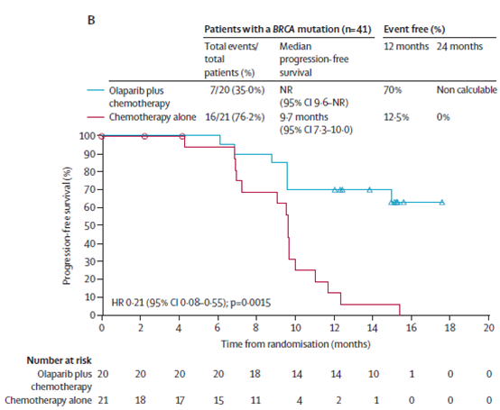 在2010年2月12日至7月30日期间,12个国家43个调查地点的173名患者被纳入研究,其中162名符合条件,并被随机分配到两个治疗组(81名为奥拉帕尼加化疗组,81名为化疗组)。在这些随机患者中,156例在联合阶段治疗(奥拉帕尼联合化疗组81例,单独化疗组75例),121例继续维持或不再进一步治疗(奥拉帕尼联合化疗组66例,单独化疗组55例)。已知107例患者的BRCA突变状态(无论是在基线还是回顾性确定):107例患者中有41例(38%)发生BRCA突变(奥拉帕尼加化疗组为20例,化疗组为21例)。奥拉帕利联合化疗组(中位数12.2个月[95%CI9.7-15.0])的无进展生存期明显长于化疗组(中位数9.6个月[95%CI9.1-9.7)(HR0.51[95%CI0.34-0.77];p=0.0012),特别是BRCA突变患者(HR0.21[0.08-0.55];p=0.0015)。