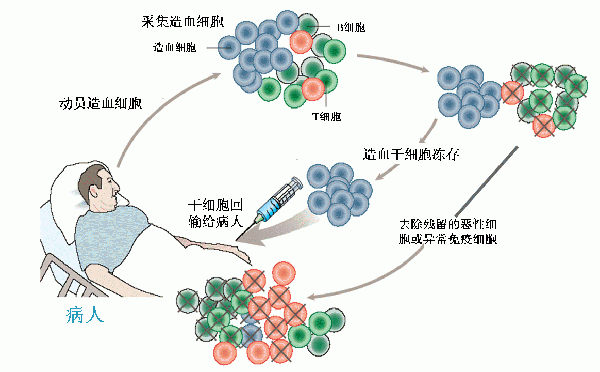 一名血液和骨髓干细胞移植者用另一个人(一名捐献者)的健康干细胞代替缺陷干细胞。干细胞是骨髓内的细胞,使红细胞和其他类型的血细胞。