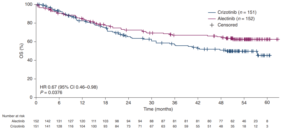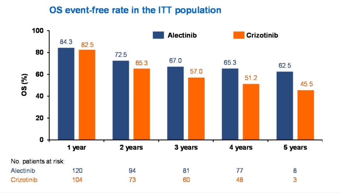此外,阿来替尼相比克唑替尼还带来了具有临床意义的OS改善,阿来替尼降低33%的死亡风险(HR=0.67,P=0.0376),5年的OS率,阿来替尼组高达62.5%,而克唑替尼组为45.5%。尽管阿来替尼组中位治疗持续时间更长(28.1 vs 10.8个月),但两组3~5级不良事件的发生率相似(52.0% vs 56.3%)。