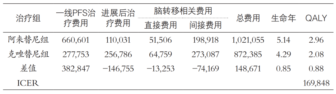 研究采用三种健康状态(无进展、进展、死亡)构建分区生存模型。临床数据、健康效用值来源于头对头的ALEX等相关临床试验、文献等。费用数据包括直接医疗费用和间接费用。研究结果显示,在30年研究时限下,阿来替尼组患者获得的质量调整生命年(QALY)为2.96 QALY,克唑替尼组为2.08 QALY,阿来替尼组多获得0.88 QALY。在各项费用中,阿来替尼组一线PFS费用高于克唑替尼,而进展后治疗费用及脑转移相关费用(直接费用和间接费用)低于克唑替尼,分别降低57%和26%。