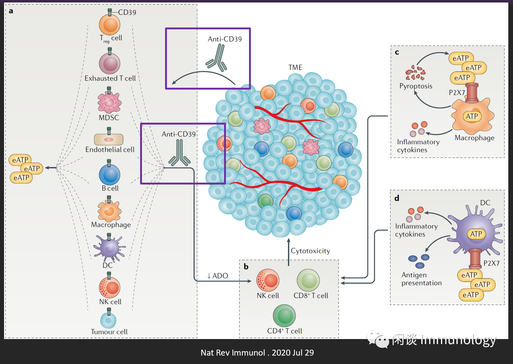 缺氧,细胞死亡(可以是免疫细胞杀死的,和自然死的等),细胞损伤,均会释放eATP,从而激活CD39。