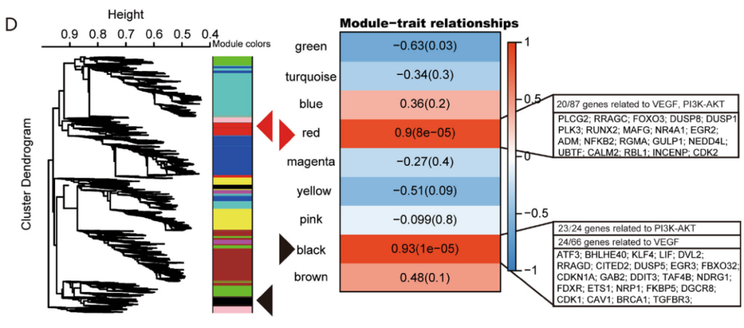 为了进一步识别安罗替尼组中基因共表达的模式,使用加权基因共表达网络分析算法构建基因共表达网络[16,17]。结果显示,与安罗替尼组表型高度相关的红色和黑色模块中(图4D),基因富集在与细胞周期密切相关的VEGF和PI3K/AKT信号通路中(黑色模块中24/66,红色模块中20/87)。结合本研究的结果和历史研究结果[18,19],说明安罗替尼参与阻断VEGF/PI3K/AKT信号通路。