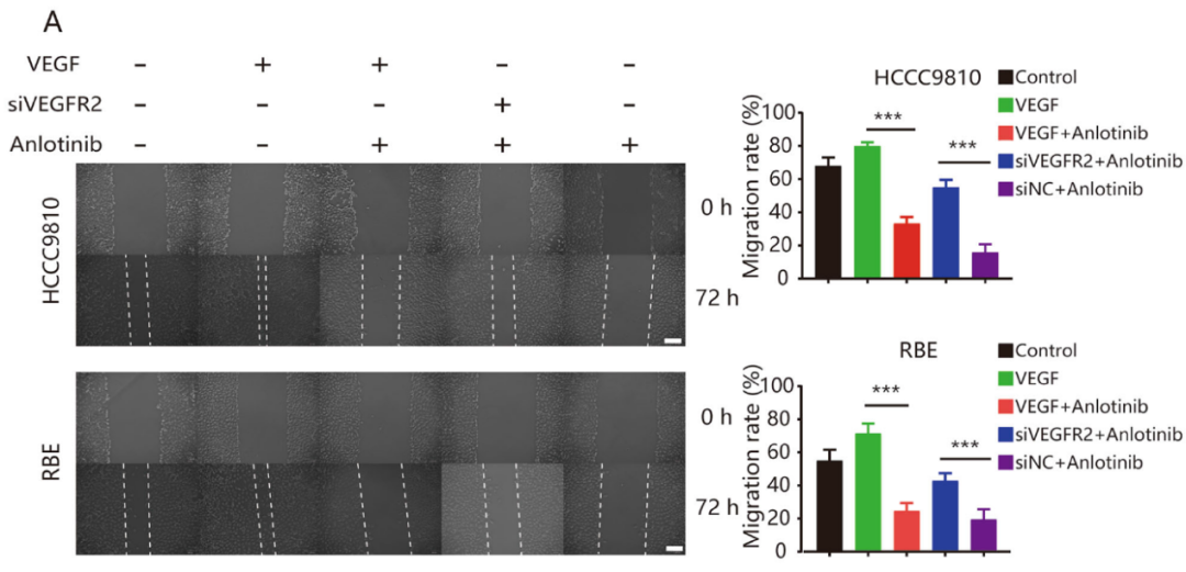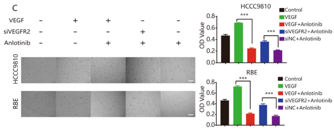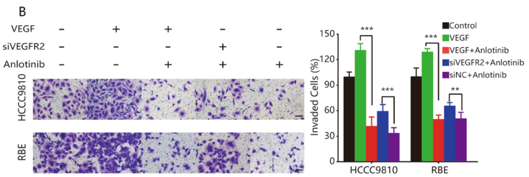 体外实验是在ICC细胞系HCC9810和RBE中进行,检测安罗替尼处理后肿瘤细胞集落形成(细胞克隆实验)及细胞的增殖能力(使用细胞计数试剂框CCK8检测法)、迁移能力(使用划痕实验)、侵袭能力(使用Transwell实验),使用流式细胞术检测安罗替尼对细胞周期和凋亡的调控。敲低VEGFR的表达使用siRNA,siNC为阴性对照。