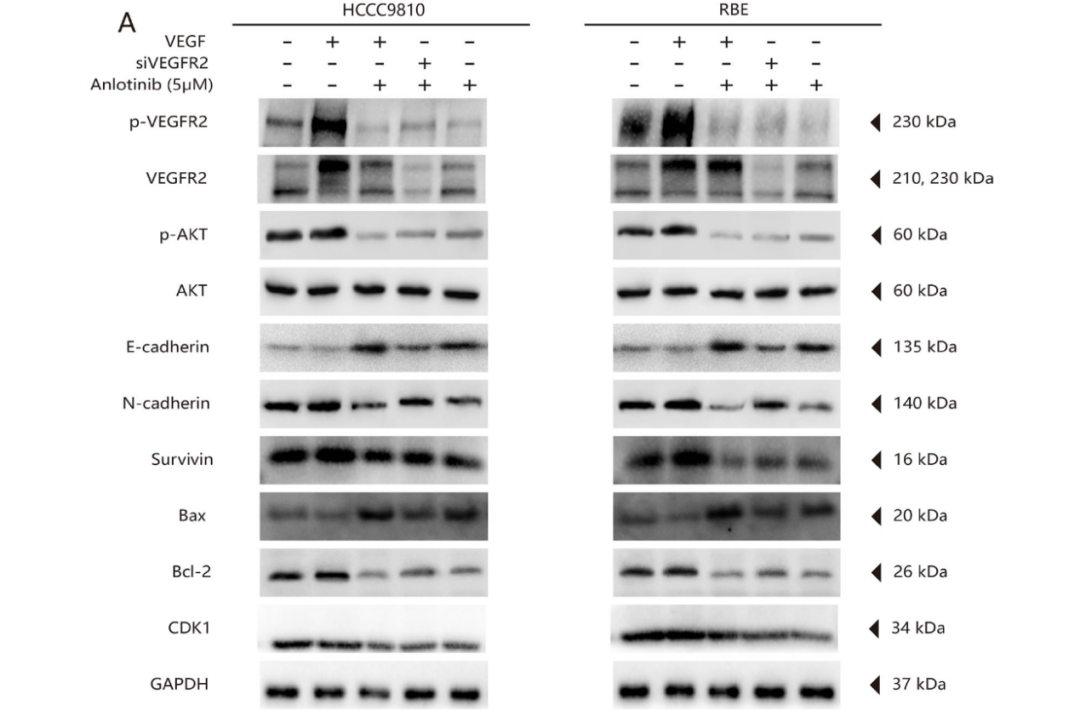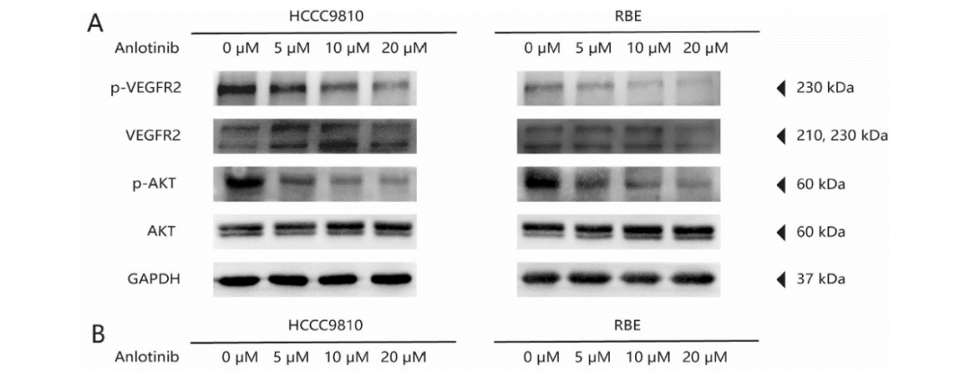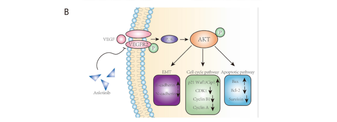 本研究证明安罗替尼主要是通过抑制VEGFR2磷酸化和AKT磷酸化,诱发下游信号通路中蛋白表达的改变,进而抑制肿瘤细胞增殖、侵袭,并且促进凋亡(图7B)。