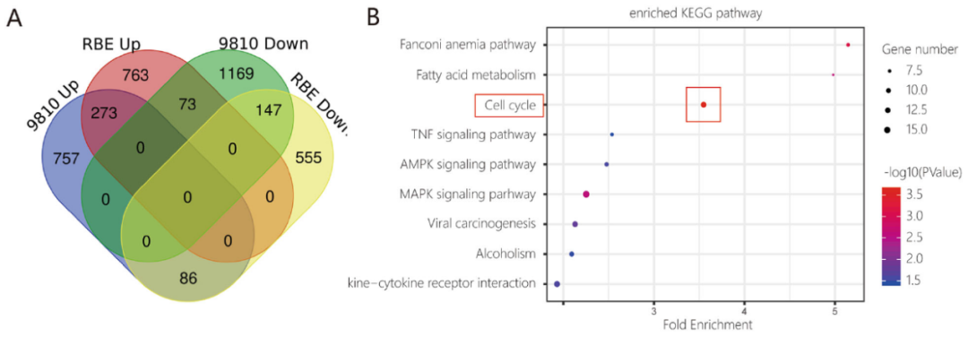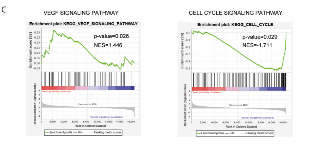 HCCC9810和RBE细胞用5μM 浓度的安罗替尼处理24小时后,对其总RNA进行深度测序和富集分析,安罗替尼组的维恩图显示有上调或下调的基因(调整后的P值<0.05,倍数变化=2.0)(图4A)。根据这些改变的基因进行KEGG富集分析,结果显示富集最显著的是细胞周期信号途径(图4B)。进行基因集富集分析发现安罗替尼组中细胞周期信号通路和VEGF信号通路都发生了富集改变(图4C)。