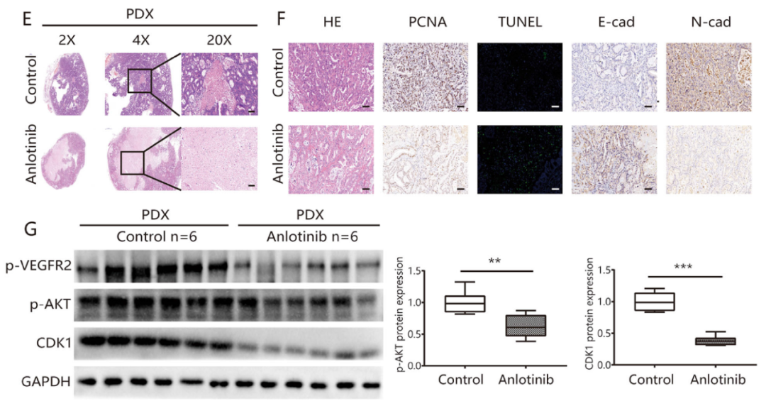检测六个PDX模型中肿瘤细胞增殖、凋亡指数和EMT的生物标志物(图3F),安罗替尼组的肿瘤细胞增殖率显著下降,凋亡指数增加,并能导致N-钙粘蛋白表达显著下调、E-钙粘蛋白表达上调。这些结果与体外实验结果均一致。