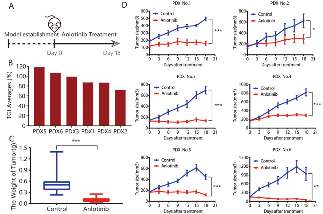 体内试验是在患者来源肿瘤异种移植小鼠(PDX)模型中进行。将6组不同患者来源的ICC肿瘤组织植入到非肥胖型糖尿病/严重合并免疫缺陷小鼠的皮肤下,经过两代小鼠传代扩增后,待肿瘤体积达到100–200mm³后,将每种患者来源的PDX小鼠随机分为两组:(1)PBS对照组(2)安罗替尼组。第18天后,收集肿瘤组织,测量重量和体积。