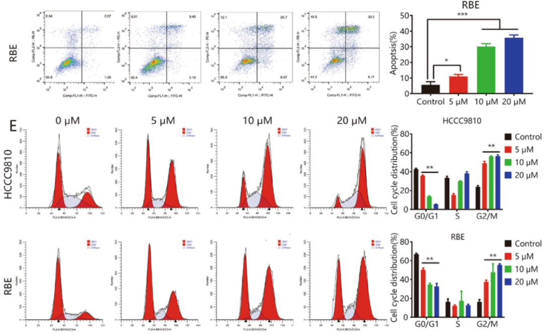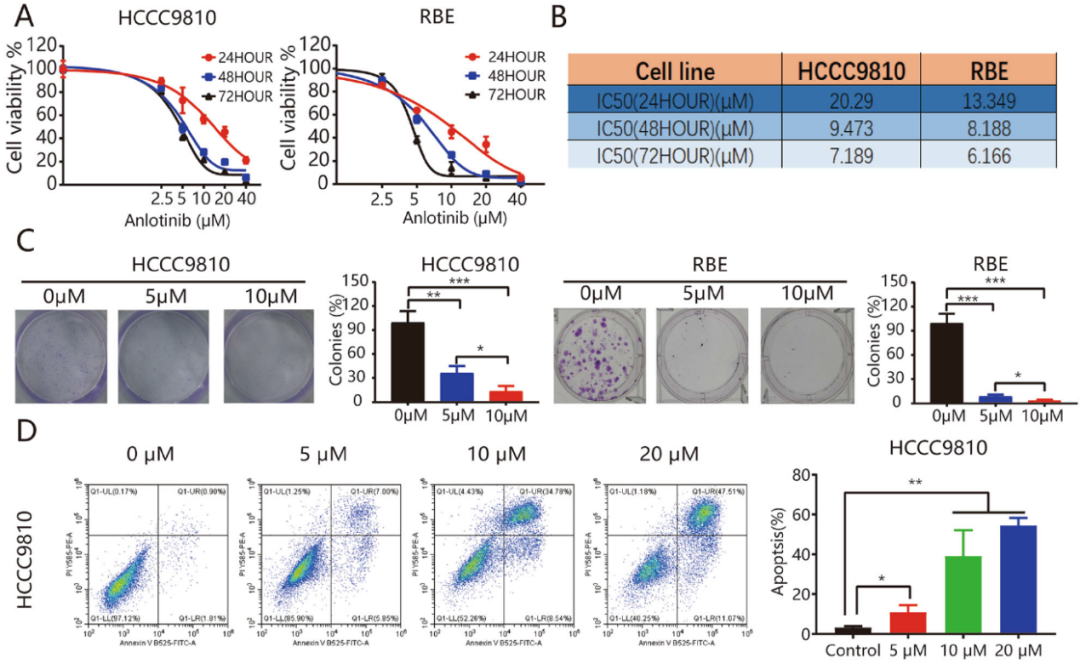 图1:安罗替尼抑制ICC细胞系的生长和侵袭,促进细胞凋亡。A和B. HCCC9810和RBE细胞用所示浓度的安罗替尼处理24、48或72h。使用CCK8测量细胞存活,并计算IC 50值;C. 集落试验的代表性图像;D. 在安罗替尼处理48小时后,测量RBE和HCCC9810细胞中凋亡的比例。E. 特定浓度的安罗替尼处理24小时,用流式细胞仪进行分析。每个实验重复三次。*P<0.05;**P<0.01。