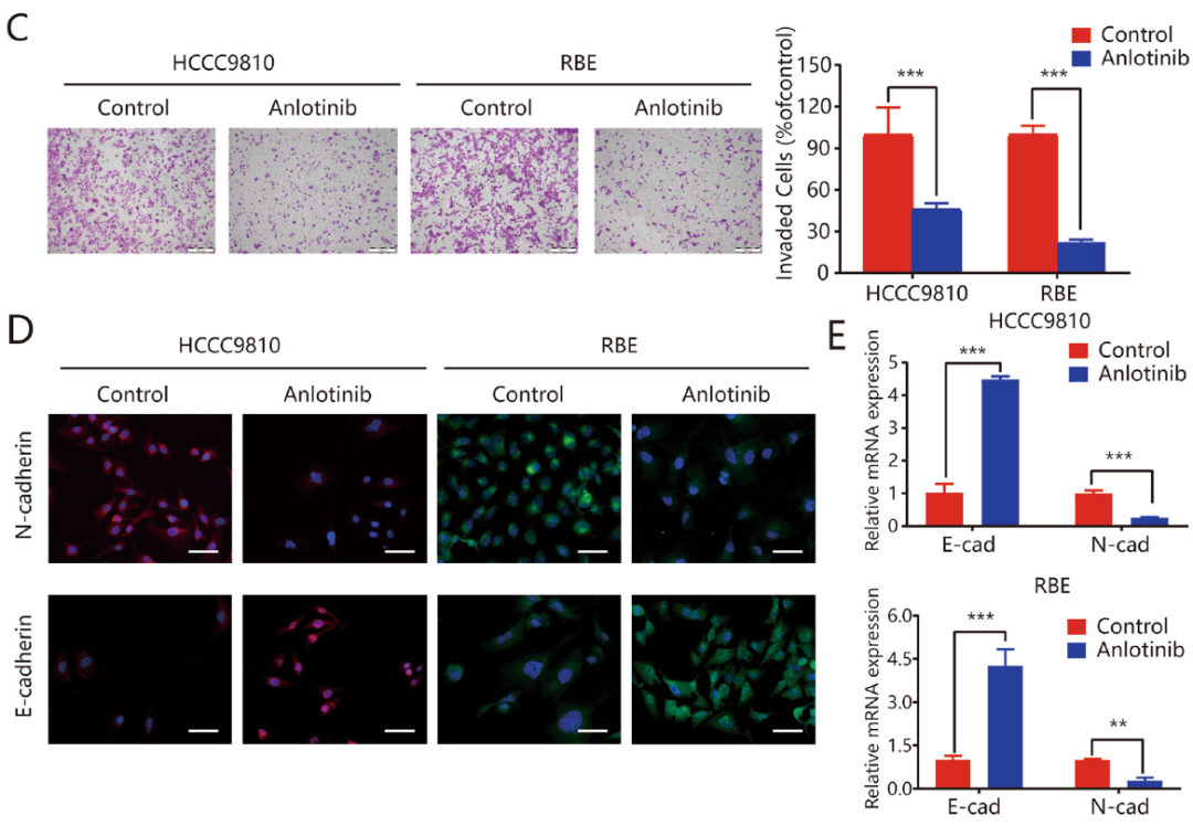 图2:安罗替尼通过抑制EMT来抑制ICC细胞的迁移和侵袭。在不使用基底胶(B)和使用基底胶(C)的情况下,用划痕(A)和Transwell实验测量安罗替尼对细胞侵袭和迁移的影响;D. 经安罗替尼处理后,采用免疫荧光染色法分析HCCC9810和RBE细胞中E-钙粘蛋白和N-钙粘蛋白标记的表达和定位。E. 使用qRT-PCR检测ICC细胞系EMT标志物(E-钙粘蛋白和N-钙粘蛋白)。*P<0.05;**P<0.01;***P<0.001。比例尺=100μm。