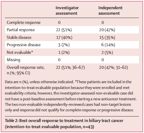 表1:胆道癌对治疗的最佳ORR(意向性治疗可评估人群,n = 43)
