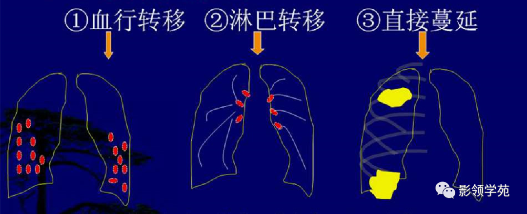 淋巴道转移:肿瘤细胞穿过血管壁侵入周围淋巴管,形成多发的小结节病灶。常发生于支气管血管周围间质、小叶间隔及胸膜下间质,并通过淋巴管在肺内播散。