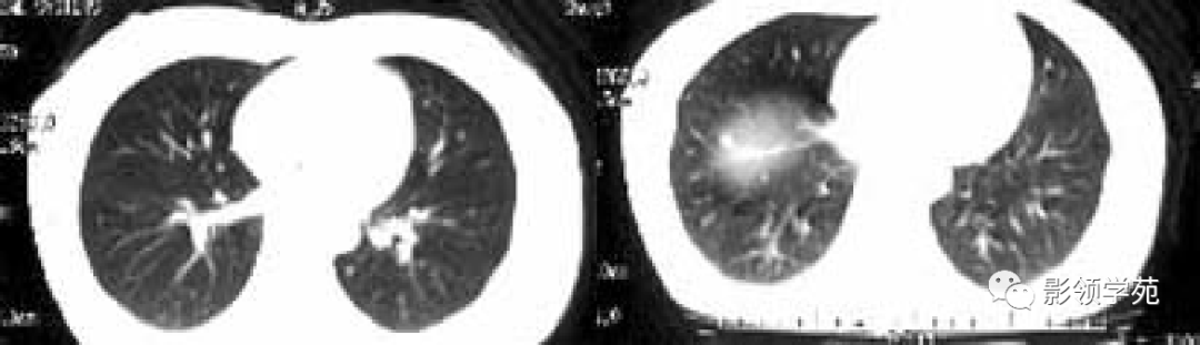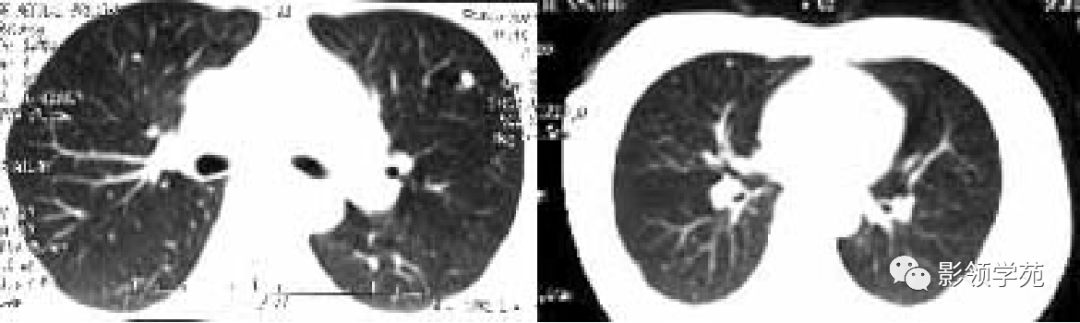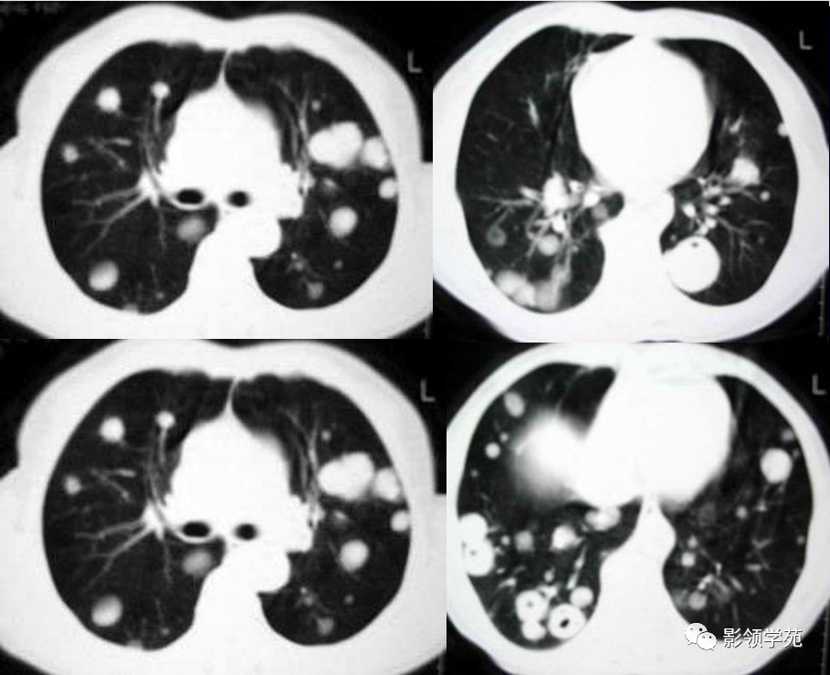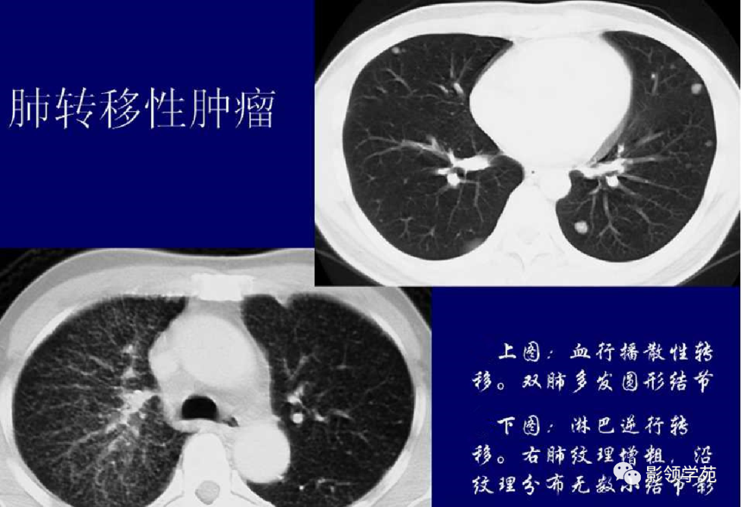 1. 血行性转移 :多发或单发结节,大小不一,边缘较清楚。少数结节伴出血时出现晕轮征,即有略高密度影像环绕结节,使病变边缘模糊。病变有钙化常见于骨肉瘤或软骨肉瘤转移。转移瘤亦可表现为空洞。两肺多发的小结节影具有随机分布的特点,HRCT显示结节位于小叶中心、小叶间隔、支气管血管束及胸膜,结节大小不均匀。