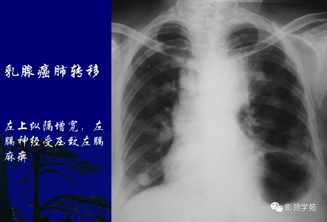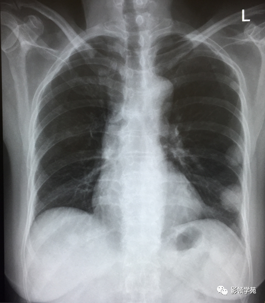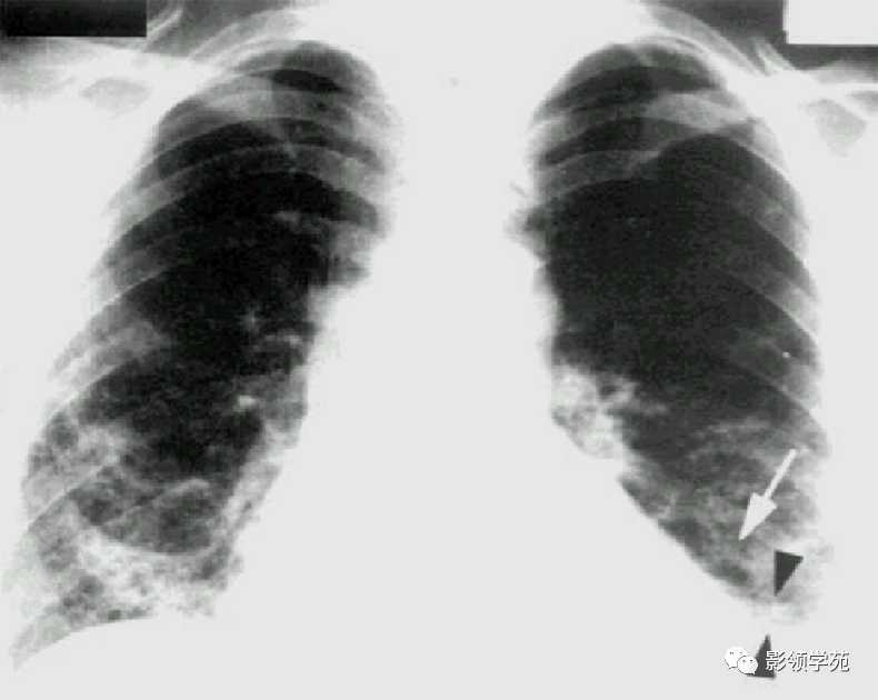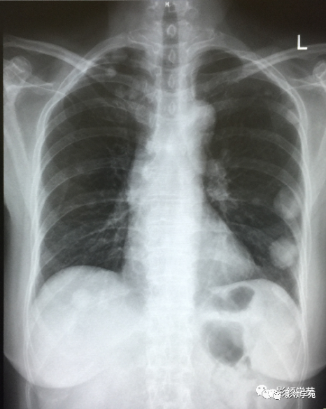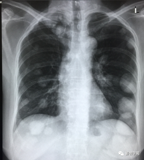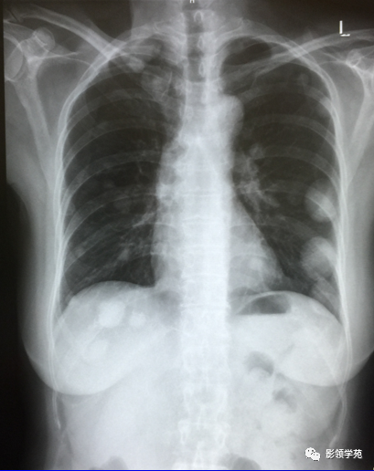 淋巴转移:肺门影增大,自肺门向外部规则索条状影(下图)