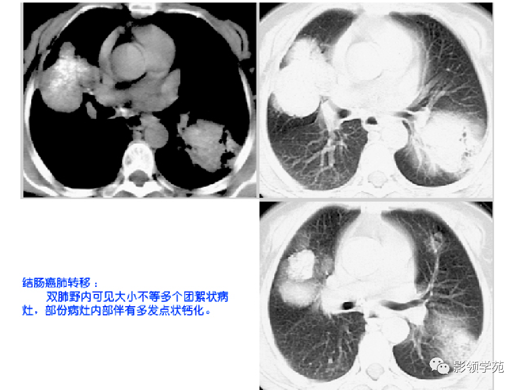 血行转移:双肺多发密度一致、大小形态不一结节状影(下图)