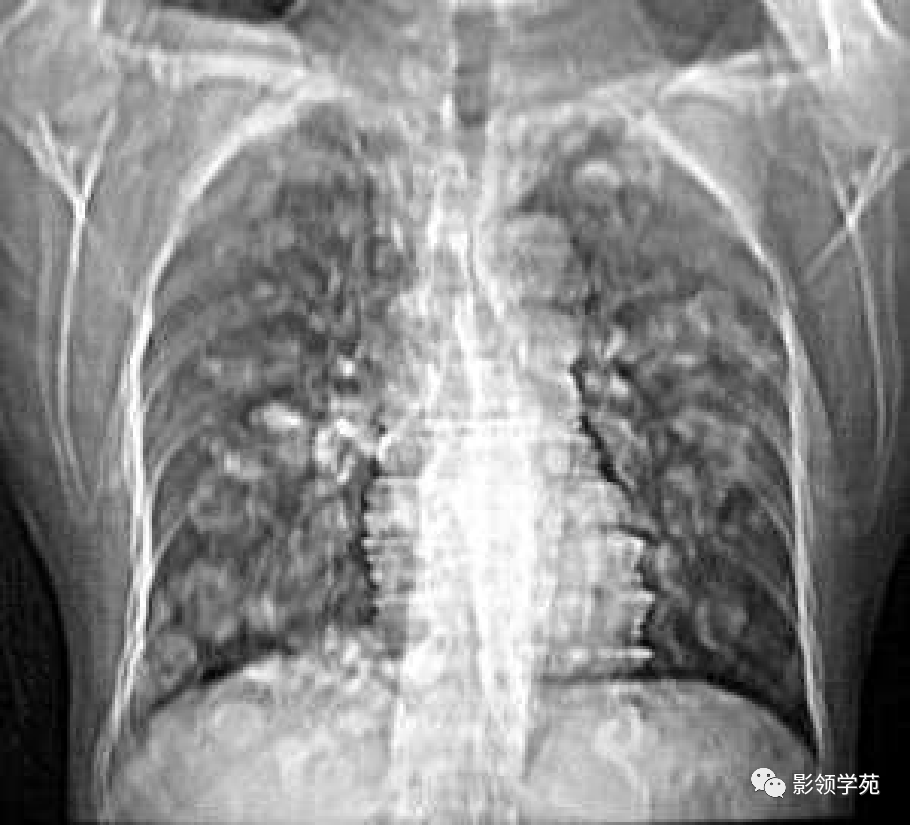 双肺淋巴道转移癌。胸部正位片示双侧中下肺野多发结节状及网格状高密度结节影,可见克氏B线(下图)