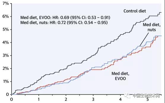 此前在西班牙对高危人群进行的一项心血管疾病预防的随机临床试验中,比较了3种饮食对心血管疾病的影响。三组饮食分别为:地中海饮食+特级初榨橄榄油(EVOO),地中海饮食+坚果(胡桃、杏仁和榛子)或低脂饮食为补充的地中海饮食。食用添加了EVOO或坚果的地中海饮食组的主要心血管疾病不良事件(心肌梗死、中风和这些原因导致的死亡)显著降低了29%,中风的发生率减少42%。