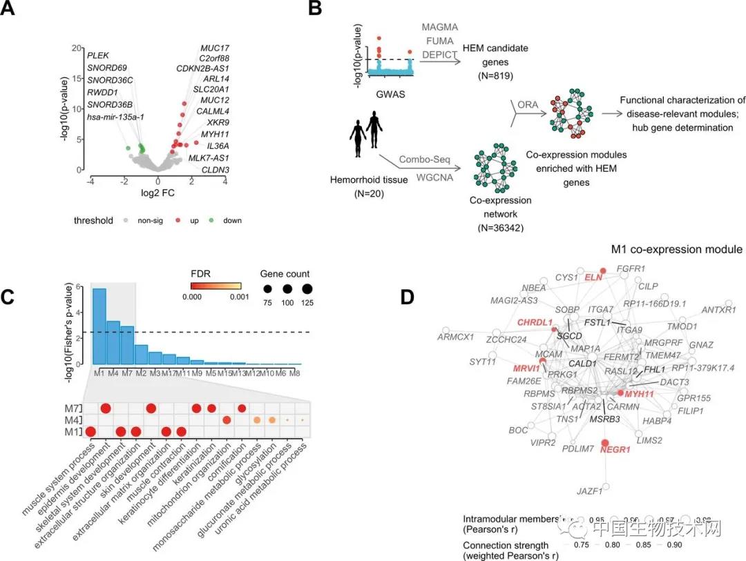 分析结果表明,痔疮与消化道、神经情感和心血管领域的其他几种疾病存在一定的遗传相关性。研究人员鉴定出102个孤立的痔疮风险基因位点,这些基因的表达富集在血管和胃肠道组织中,并共同参与控制平滑肌功能以及肠道上皮和内皮结构的发育和完整性。