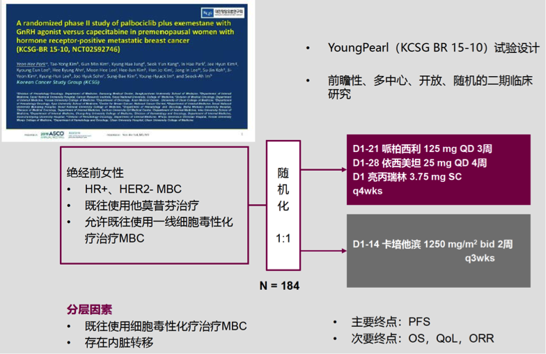 对于HR+/HER2-转移性乳腺癌患者是选择靶向CDK4/6抑制剂联合内分泌治疗还是化疗?2019年ASCO报道的YoungPearl研究的结果[1],给了临床选择的方向。入组患者为HR+/HER2-的转移性乳腺癌患者,根据患者既往是否接受过细胞毒性化疗以及是否存在内脏转移来作为分层因素。患者随机入组CDK4/6抑制剂+AI组或者单纯化疗组。