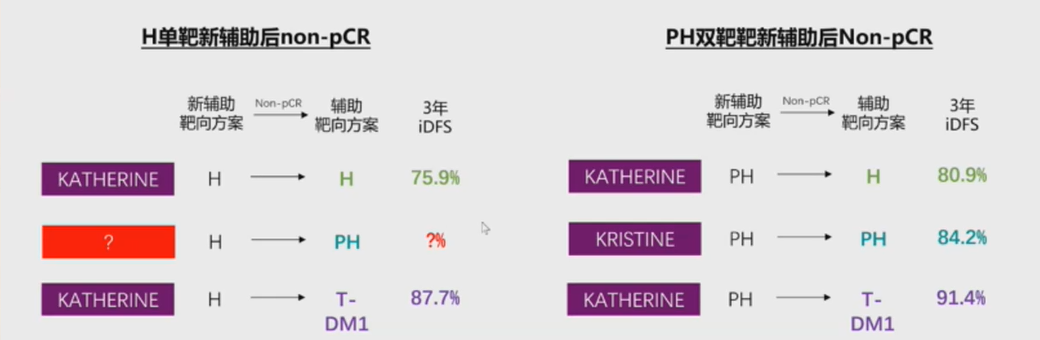对于新辅助治疗后non-pCR的患者,KATHERINE研究带来了HER2阳性早期乳腺癌治疗的变革。而通过不同研究间新辅助到辅助过程中单靶和双靶的线序选择分析可发现,无论是单靶还是双靶新辅助治疗,non-pCR患者选择T-DM1升级辅助治疗,能取得最佳的生存获益。